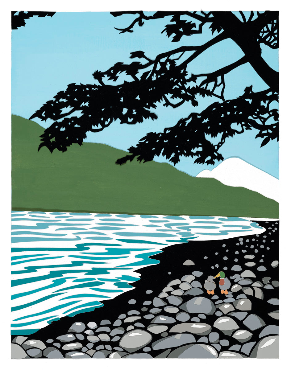 This artwork features a combination of media, including paper cutouts and acrylic paint on canvas paper. It was created in 2025 and is inspired on his trip to Mt. Rainier, Washington, as a child. The piece measures 11 x 14in. in size.
